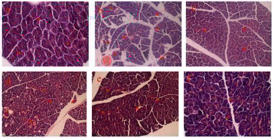 As shown in Figure 5a, the pancreatic cells in NG mice showed a compact and ordered arrangement, as well as displayed a regular shape. Moreover, intercellular spaces were distributed uniformly, and congestion in central vein was not obvious. In MG mice (Figure 4b), serious pathological damages, such as focal necrosis, congestion in central vein, and infiltration of lymphocytes, were observed. In addition, the pancreatic cells showed a seriously altered shape, and they showed very irregular distribution. The pathology of pancreatic tissue generally demonstrates the varying degrees of damages in STZ-induced diabetic mice. In PG mice, the shape and size of the pancreatic cells was relatively homogeneous and are orderly packed. Moreover, the conditions of focal necrosis and infiltration of lymphocytes improved obviously (Figure 5c). The alleviation of pancreatic pathological damages varied in a dose-dependent manner in RPP-treated groups. As shown in Figure 4d–f, the protective effect of RPP-H was significantly better than that of RPP-L and RPP-M. In RPP-H mice, histological damage was notably mitigated and the conditions were restored to nearly the normal state.