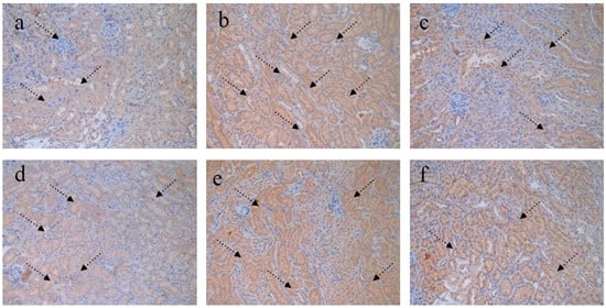 Effect of RPP on the TGF-β1of kidney (TGF-β1 stain, 200×). (a) NG (Normal group); (b) MG (STZ, Model group); (c) PG (STZ, DMBG 10 mg/kg); (d) RPP-L(STZ, 50 mg/kg RPP); (e) RPP-M (STZ, 100 mg/kg RPP); (f) RPP-H (STZ, 200 mg/kg RPP).