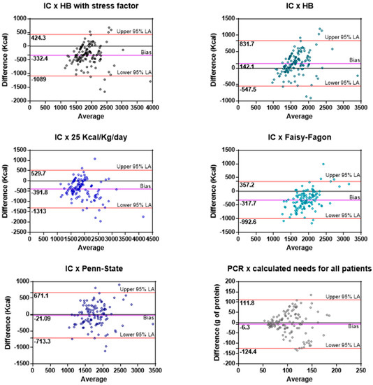 Bland-Altman plots of the agreements between indirect calorimetry or protein catabolic rate and predictive equations.