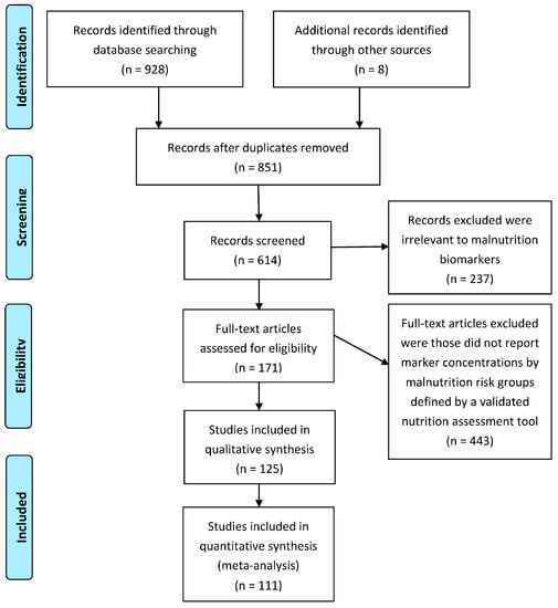 Titles and abstracts resulting from the search strategy were evaluated by two independent investigators. Disagreements were resolved by consensus and, when necessary, by consultation with another investigator. One reviewer performed the data extraction with a second investigator checking the data extraction forms for accuracy and completeness. The studies were grouped according to individual blood biomarkers and the validated nutrition screening tools used. Data were extracted and collated on the following study characteristics: reference, study design, clinical settings (inpatient, outpatient, institutionalized, and home care), subjects (number of subjects, age, and gender ratio), health concerns, nutrition assessment tools, biomarkers, key results, and conclusions. Patients admitted to the intensive care unit (ICU), acute/critical/emergency units, experienced infections, trauma, burns, or post-surgery were considered acute. Disease acuteness was coded as ICU, acute (Y), non-acute (N) or both (B). The primary outcome required was mean and standard deviation (SD) of biomarker values in different malnutrition groups classified by a nutrition assessment tool. Where appropriate, we contacted lead authors for missing data and to clarify suspicious values of biomarker measurements. Outliers of biomarker values were flagged and checked during subsequent statistical analysis.
