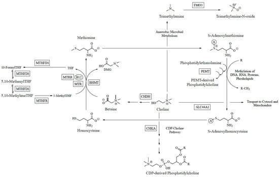 - Ganz, A.B.; Shields, K.; Fomin, V.G.; Lopez, Y.S.; Mohan, S.; Lovesky, J.; Chuang, J.C.; Ganti, A.; Carrier, B.; Yan, J.; et al. Genetic Impairments in Folate Enzymes Increase Dependence on Dietary Choline for PC Production at the Expense of Betaine Synthesis. FASEB J. 2016, 30, 3321–3333. [Google Scholar] [CrossRef] [PubMed]