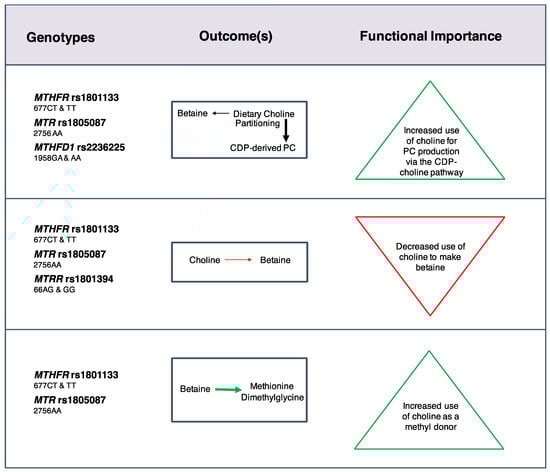 Effects of common genetic variants that impair folate metabolic enzymes on choline dynamics at adequate choline and folate intakes. Black arrows represent relative differences in the partitioning of dietary choline between metabolic endpoints. Green arrows and red arrows represent an increased and decreased flux of dietary choline, respectively, for a given metabolic outcome [23].