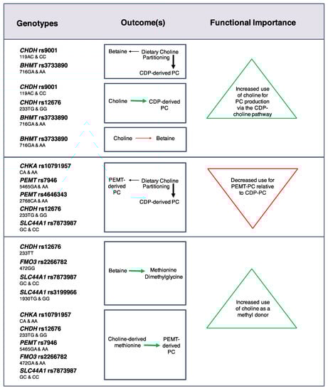 Effects of common genetic variants in choline metabolic enzymes on choline dynamics at adequate choline and folate intakes. Black arrows represent relative differences in the partitioning of dietary choline between metabolic endpoints. Green arrows and red arrows represent an increased and decreased flux of dietary choline, respectively, for a given metabolic outcome [24].