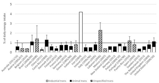 The data summarized in this systematic review show that for 22 out of 29 countries, the intake of total trans fat is currently below the recommended maximum intake of 1 En%. Like earlier studies from Craig-Smith and Micha [,], we also showed that total trans fat intakes have been decreasing over the past decades. This review is the first to distinguish trans fat intake from animal and industrial sources.