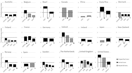 Time trends of intakes of trans fat and its sources in populations from 20 countries. Data reported by year of food composition data. Symbols on the time-axis refer to the year of the introduction of voluntary reductions (*), mandatory labeling (+), or mandatory limits (^) to lower trans fat intake. The dotted lines represent the maximal recommended intake level of trans fat [].