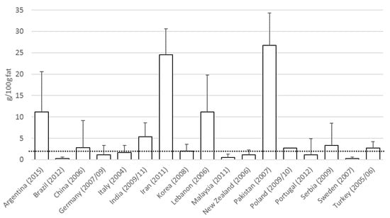 The last limitation is the imperfect distinction between industrial, animal and ruminant trans fat sources. Ruminant trans fat mainly comes from dairy, beef, and lamb, but non-ruminant animal foods such as pork, chicken and fish can also contain trans fat []. The source of this trans fat is unclear, but it may come from animal feed made with industrial trans fat. In this review we reported total animal trans fat, because in most dietary surveys no distinction was made between ruminant and non-ruminant animal food groups. The reporting of animal trans fat sources may lead to a minor overestimation of ruminant trans fat intakes. For example, in the 2011 survey from the Netherlands, 0.32 En% of the total trans fat intake came from ruminant animal sources and 0.01 En% from non-ruminant animal sources. In addition, in case a food group in a dietary survey contained both animal and industrial foods (e.g., the food group ”fats and oils” comprising both butter and margarines), we considered this food group an industrial trans fat source. This may underestimate animal trans fat and overestimate industrial trans fat intakes. For example, in one third of the datasets trans fat intake from butter was not separately reported. From available data, we calculated that per country the average trans fat intake from butter was 0.07 En%. As a result, industrial trans fat intake may have been overestimated. Likewise, the trans fat source in biscuits could either be industrial sources or butter. Butter may comprise trans fat levels up to 6% of total fat. In an extreme scenario assuming that all biscuits containing trans fat levels up to 6% of total fat are made from butter, in four countries, Argentina (2015), Iran (2011), Lebanon (2006) and Pakistan (2007) biscuits must have high industrial trans fat levels.