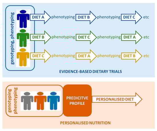 An increasing number of studies indicate the need to apply precision nutrition approaches to personalise disease risk and, in parallel, future dietary recommendations. Further developments in this area will depend on big data analysis and health informatics that can capture molecular and medical data. Ultimately, the success of precision nutrition approaches will depend on the robust application of appropriate study designs as the predictive role of biomarkers cannot be definitively ascertained without randomly assigning subjects to some form of control treatment [54].