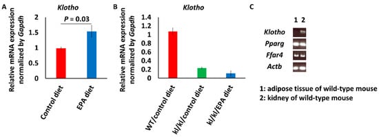 Klotho (kl/kl) mRNA expression levels in kidneys of mice. (A) Klotho mRNA expression levels in kidneys of wild-type mice fed a diet with or without eicosapentaenoic acid (EPA). Data are shown as means ± SE (Control diet, n = 4; EPA diet, n = 8) and were analyzed using Student’s t test; (B) Klotho mRNA expression levels in kidneys of kl/kl mice fed a diet with or without EPA. Data are shown as means (n = 2 in each group); (C) Reverse transcription-polymerase chain reaction (RT-PCR) showed the mRNA of EPA receptors, Pparg and Ffar4, in the kidney.