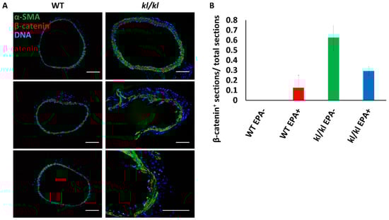 The medial layer, which was α-SMA positive, showed hyperplasia, while the expression of β-catenin, an intracellular signal transducer in the Wnt signaling pathway, was detected in more sections of aortas from kl/kl mice (control diet, number of animals = 2 and number of tissue sections = 7; EPA diet, number of animals = 2 and number of tissue sections = 6) than in sections of aortas from wild-type mice (control diet, number of animals = 2 and number of tissue sections = 6; EPA diet, number of animals = 2 and number of tissue sections = 7) (Figure 2A,B).