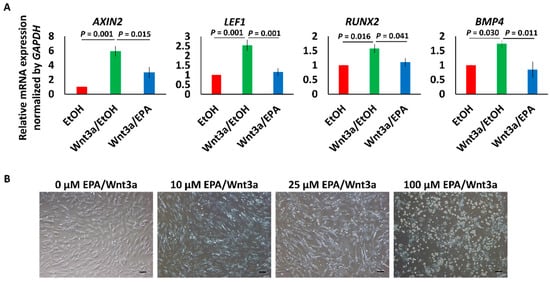 Wnt3a (100 ng/mL) increased not only the expression of Wnt signaling marker genes AXIN2 and LEF1, but also the expression of RUNX2 and BMP4, which are genes associated with vascular calcification [,,,,]. Upregulation of these genes was suppressed by 25 μmol/L EPA (Figure 3A). EPA did not completely suppress the upregulation genes by Wnt3a at 10 μmol/L, and 100 μmol/L EPA induced cell death (Figure 3B). We therefore used 25 μmol/L EPA in subsequent experiments.
