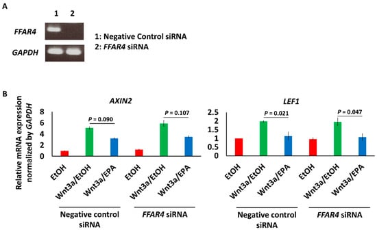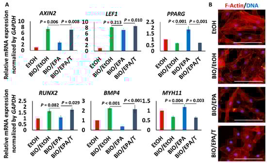 BIO (1 μmol/L), a GSK-3 inhibitor that activates β-catenin signaling, also increased the expression of AXIN2, LEF1, RUNX2 and BMP4. Upregulation of AXIN2 and BMP4 was significantly suppressed, and RUNX2 tended to be suppressed by 25 μmol/L EPA. EPA is known as a PPARγ agonist and also increased PPARG expression. The effects of EPA were cancelled by 10 μmol/L T0070907, a PPARγ inhibitor (Figure 4A). Additionally, BIO made actin fibers sparse, and EPA modestly mitigated the morphological change. The expression of MYH11, a mature contractile smooth muscle cell marker, was decreased by BIO, and the expression was recovered by EPA. T0070907 cancelled the effect of EPA (Figure 4A,B). The knockdown of FFAR4, a receptor of ω-3 fatty acids, did not cancel the inhibitory effect of EPA on AXIN2 and LEF1 expression (Figure 5A,B) [].