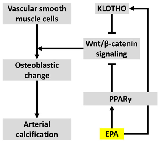 Our study revealed that EPA upregulated the expression of Klotho, a Wnt signaling inhibitor, in the kidney and inhibited Wnt signaling in osteogenic VSMCs via PPARγ, as shown in Figure 6. These results suggested that the effects could lead to the suppression of vascular calcification. In addition to our previous study, the results of the present study using human VSMCs suggested that EPA can also affect human vascular calcification by the suppression of Wnt signaling []. This study is therefore a step toward the pathology of arteriosclerosis.