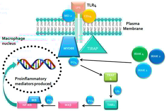 This signaling pathway involves the activation of the sorting adaptor molecule toll/interleukin-1 receptor (TIR)-domain-containing adaptor protein (TIRAP) that recruits MYD88 to the intracellular domain (Figure 1) [48]. The MYD88 then recruits the interleukin-1 (IL-1) receptor-associated kinase 1 (IRAK-1), IRAK-2, and IRAK-4, which will phosphorylate and activate the tumor necrosis factor (TNF) receptor-associated factor 6 (TRAF6) [47]. TRAF6 will add ubiquitin to the transforming growth-factor-beta-activated kinase 1 (TAK1), allowing TAK1 to bind to and phosphorylate the inhibitor of kappa B kinase-beta (IKKβ) [47]. The IKKβ will then phosphorylate the inhibitor of kappa B (IκB) [47]. Normally, IκB is bound to the transcription factor nuclear factor kappa B (NF-κB), sequestering it within the cytoplasm and preventing its nuclear translocation [33]. However, phosphorylation of IκB causes its degradation, thereby allowing NF-κB to enter the nucleus and increase the expression of pro-inflammatory cytokines such as IL-6, IL-1β, IL-27, and tumor necrosis factor-alpha (TNF-α), chemokines such as MCP-1 and cell adhesion molecules such as VCAM-1 [33,47,48,49].