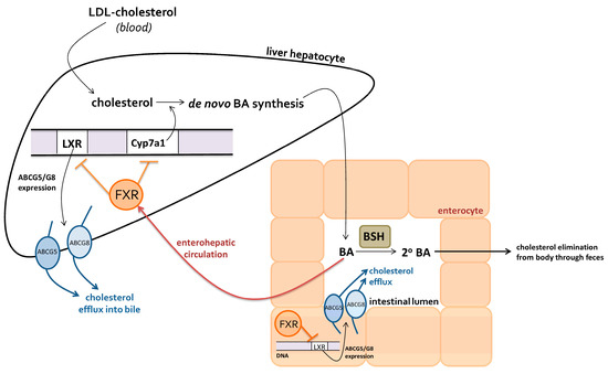 Decreased BSH activity due to dysbiosis leads to less primary BA conversion and therefore more BAs being re-absorbed into the enterohepatic circulation. This causes an increased activation of hepatic FXR, which inhibits the expression of the BA synthetic enzyme cholesterol 7 alpha-hydroxylase (Cyp7a1), and the nuclear receptor LXR [55]. Greater inhibition of Cyp7a1 results in decreased synthesis of BAs, and consequently, lower serum cholesterol uptake by the liver. LXR expression normally promotes the upregulation of cholesterol transporters ABCG5/G8, increasing cholesterol efflux from hepatocytes and enterocytes [55]. Therefore, FXR-driven LXR inhibition results in the downregulation of ABCG5/G8, promoting cholesterol accumulation within the liver and intestinal cells. Due to its role in regulating BA signaling, reduced bacterial BSH activity can lead to the accumulation of cholesterol, promoting the formation of foam cells, and ultimately, atherosclerotic plaque [34].