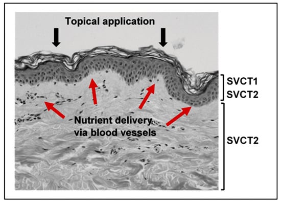 The skin can be targeted for nutrient delivery through topical application (Figure 2). However, in this case the delivery vehicle is influential, as the stratum corneum functions as an effective aqueous barrier and prevents the passage of many substances []. Although some uncharged and lipid-soluble molecules can pass through the surface layer, it is unlikely that nutrients delivered via topical application would easily penetrate into the lower layers of the dermis []. The dermal layer functions are therefore best supported by nutrients delivered through the bloodstream.