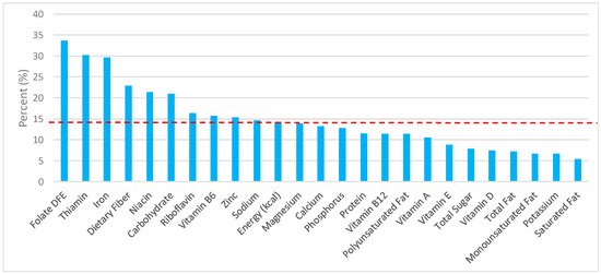 Grain foods sources of energy and nutrients using the National Health and Nutrition Examination Survey (NHANES) 2009–2012, for adults. Data are for all adults ≥19 years of age (n = 10,697; males and females), Day 1 intakes; dashed red line represents the percentage of energy provided and nutrients that surpass energy (kcal) contribution. Thus, nutrients above the dashed red line show the food category provides a greater percentage in the diet to showcase meaningful nutrient density in the diet per day. DFE, dietary folate equivalents.