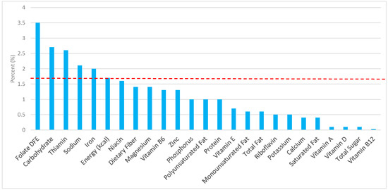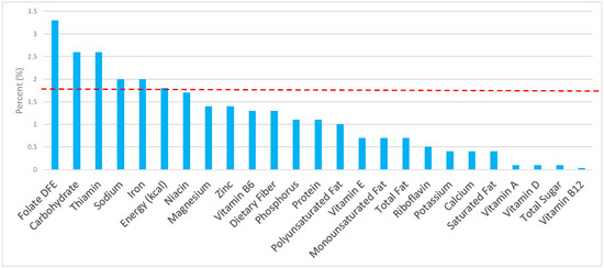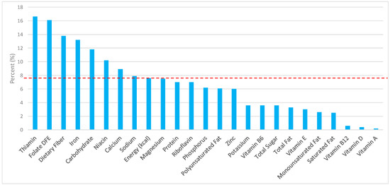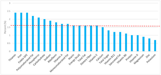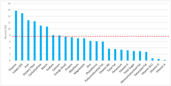 Quick breads and bread products as sources of energy and nutrients using NHANES 2009–2012, for adult females. Data are for adult females aged ≥19 years of age (n = 5349), Day 1 intakes; dashed red line represents the percentage of energy provided and nutrients that surpass energy (kcal) contribution. Thus, nutrients above the dashed red line show the food category provides a greater percentage in the diet to showcase meaningful nutrient density in the diet per day.