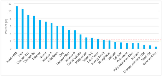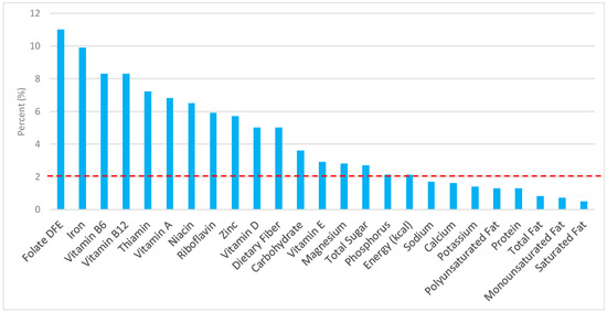 Ready-to-eat cereals as sources of energy and nutrients using NHANES 2009–2012, for adult females. Data are for adult females aged ≥19 years of age (n = 5349), Day 1 intakes; dashed red line represents the percentage of energy provided and nutrients that surpass energy (kcal) contribution. Thus, nutrients above the dashed red line show the food category provides a greater percentage in the diet to showcase meaningful nutrient density in the diet per day.