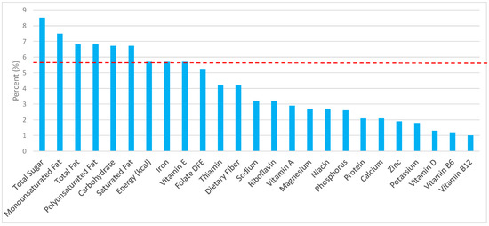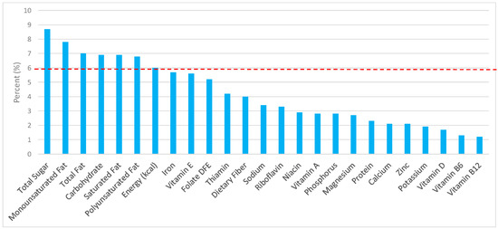 For adult males (Figure 5), ready-to-eat cereals contributed 1.7% of sodium, 2.7% of total sugar, minimal amounts of total and saturated fat and less than 3% of total energy—specifically, 0.8% of total fat and 0.5% of saturated fat in the daily diet, in exchange for 2.1% of total energy. For shortfall nutrients identified by the 2015–2020 DGA [1], ready-to-eat cereals contributed approximately 13.8% of total dietary fiber, 16.1% of folate, 13.2% of iron, 8.9% of calcium, and 7.5% of magnesium daily. Ready-to-eat cereals further contributed 16.6% of thiamin, 10.2% niacin, 7.0% riboflavin, and 6.0% of zinc per day.