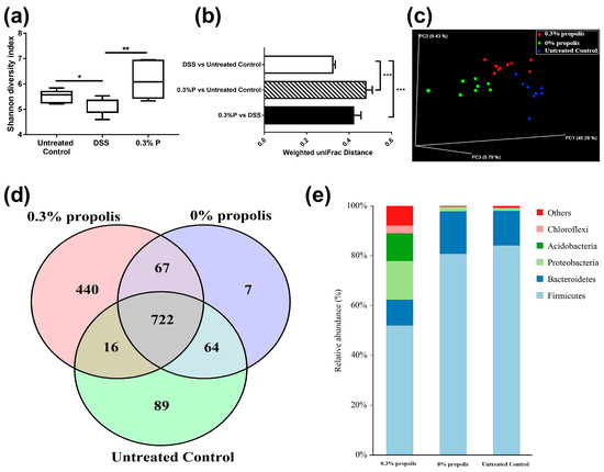 Propolis altered the composition of the intestinal microbiota in colitis rats. Rats’ caecal digesta from untreated control, 0% propolis and 0.3% propolis groups were collected and the intestinal microbiota were examined by 16S rRNA sequencing. (a) Alpha diversity was analysed by Shannon diversity index; Data are presented as box plots, n = 8 rats/group; * p < 0.05, and ** p < 0.01 significant difference among two groups; (b) Beta diversity between the groups was analysed by weighted UniFrac distance. Data are the mean ± SEM (n = 8). *** p < 0.001 significant difference among two groups; (c) PCoA plot of the gut microbiota based on an unweighted UniFrac metric; (d) Venn diagram of OTUs showed microbiota differences between untreated control (green area) and 0% propolis (red area) and between 0.3% propolis (blue area), showing strains altered in these groups, and the overlap among them; and (e) relative abundance of predominant bacteria at the phylum level. Data are presented as a staked bar chart, n = 8 per group.