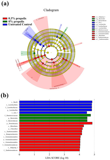 Characteristics of microbial community composition using LEfSe analysis. (a) Taxonomic cladogram obtained from LEfSe analysis of 16S rRNA sequencing. Red shaded areas indicate the 0.3% propolis supplement taxa; green shaded areas indicate the 0% propolis taxa and blue shaded indicate untreated control taxa; (b) Taxa value meeting a significant LDA threshold value of >4.0 are shown, which are displayed with a positive LDA score.