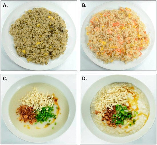 The four test meals consumed in each study. (A) Participants in Study 1 consumed olive fried rice; (B) Participants in Studies 2 and 3 consumed Yang Chow fried rice; Participants in Study 4 consumed (C) thin and (D) thick chicken rice porridge varying in energy density.