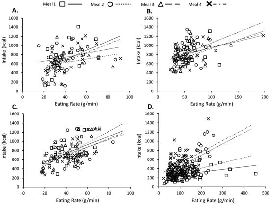 Scatter plots of individual eating eates and energy intake across each of the four test meals consumed in (A) Study 1; (B) Study 2; (C) Study 3; and (D) Study 4. The lines represent the regression line of best fit for each meal.