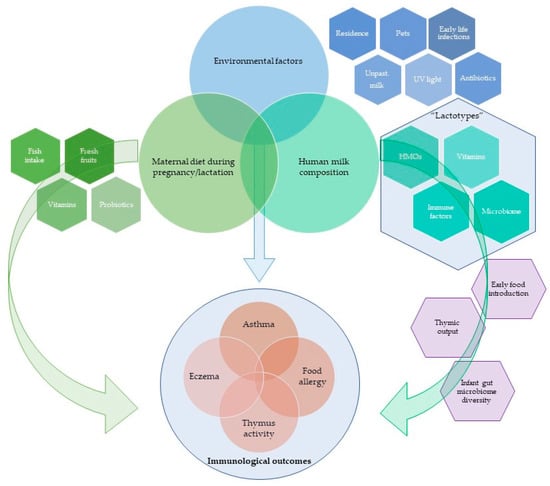 Existing data provides evidence that HM composition is highly variable within the same individual and between women. It has been shown that maternal lifestyle (dietary habits, physical activity, place of residence) can have a significant influence on HM biologically active components [,,,]. These findings have motivated a number of intervention trials aiming to prevent allergy development in early infancy.