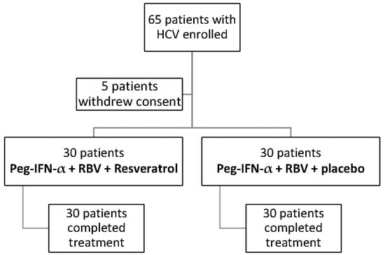 This observational study was conducted at the Department of Senescence, Cannizzaro Hospital, University of Catania (Italy), between February 2011 and July 2015. Sixty patients have been enrolled (35 males, 25 females) (Table 1). The patients received Peg-IFN-α-2b at dose 1.5 mg/kg per week; Ribavirin (RBV) at dose 1200 mg for 12 months; N-acetylcysteine 600 mg and lactoferrin 23.6 g three times day (Group A, 30 patients) or at dose 1.5 mg/kg per week; RBV at dose 1200 mg for 12 months; and N-acetylcysteine 600 mg, lactoferrin 23.6 g and RV in pills 19.8 mg three times day (Group B, 30 patients) for 12 months (Figure 1). The RV dosage was determined by studies on the best antioxidant and anti-inflammatory effect, improving also mitochondrial functions [25,26]. Patients were randomized into two groups (treatment versus placebo) using permuted-block randomization with an allocation ratio of 1:1 and a block size of 4. Random numbers were assigned to patients according to the sequence of their inclusion and patients received respective study products. Both clinical investigators and patients were blind to the product given. Peg-IFN-α, RBV and placebo were administered to subjects in Group A (Figure 1 trial profile). Peg-IFN-α, RBV, N-acetylcysteine 600 mg, lactoferrin 23.6 g and RV 19.8 mg were administered to subjects in Group B. Subjects were evaluated before starting therapy, and after 1, 6 and 12 months. Eligible patients were were 18 years of age or older, and HCV patients treated with Peg-Interferon and RBV. HCV infected populations must have elevated serum alanine transaminase levels and findings on liver biopsy consistent with chronic infection. Ineligible patients were those who had other liver diseases, positivity tests for serum HBsAg, for HIV antibodies, negativity for HCV antibodies and those who were affected by alcoholic liver disease, pulmonary and renal diseases, decompensated cirrhosis, pregnancy, hemoglobinopathies, autoimmune disorder, endocrinopathy and severe neuropsychiatric diseases. Hematochemical, virological, instrumental and histological analysis were performed on these patients. All subjects underwent a physical examination and medical interview before treatment. All patients were recruited in observation and respect of Helsinki Declaration [27] and gave their informed consent for the study participation and for each procedure they underwent. This study was approved by Cannizzaro Hospital Ethics Committee. All sensitive data were collected and protected in respect of present privacy statements.