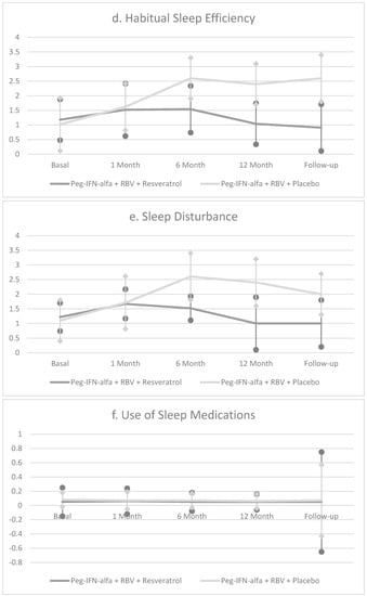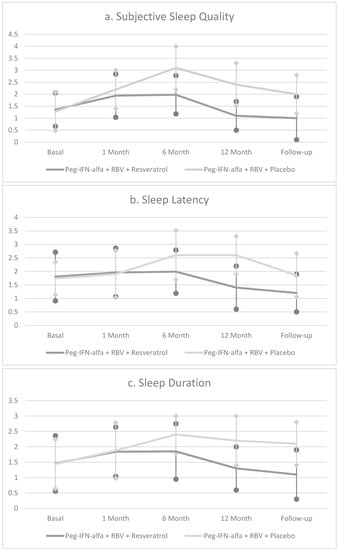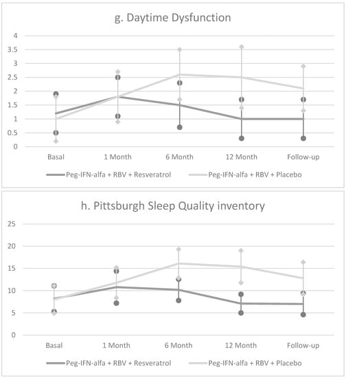 Background: Hepatitis C virus infection and interferon treatment have shown to be risk factors for sleep disorder health-related quality of life. Aim: To determine whether the effects of resveratrol on sleep disorders were associated with different tests in subjects with chronic hepatitis C treated with Peg-IFN-α and RBV. Patients and Methods: In this prospective, randomized, placebo controlled, double blind clinical trial, 30 subjects (Group A) with chronic hepatitis received Pegylated-Interferon-α2b (1.5 mg/kg per week), Ribavirin and placebo (N-acetylcysteine 600 mg and lactoferrin 23.6 g), while 30 subjects (Group B) received the same dosage of Pegylated-Interferon-α2b, Ribavirin and association of N-acetylcysteine 600 mg, lactoferrin 23.6 g and Resveratrol 19.8 mg for 12 months. All subjects underwent laboratory exams and questionnaires to evaluate mood and sleep disorders (General Health Questionnaire (GHQ), Profile of Mood States (POMS), Pittsburgh Sleep Quality Inventory (PSQI), Epworth Sleepiness Scale (ESS)). Results: The comparison between Group A and Group B showed significant differences after six months in C-reactive protein (p < 0.0001); after 12 months in aspartate aminotransferase (AST) (p < 0.0001) Viremia (p < 0.0001), HAI (p < 0.0012) and C-reactive protein (p < 0.0001); and at follow up in AST (p < 0.0001), Viremia (p < 0.0026) and C-reactive protein (p < 0.0001). Significant differences were observed after 12 month and follow-up in General Health Questionnaire, after 1, 6, 12 and follow-up in Profile of Mood States, after 6, 12, follow-up in Pittsburgh Sleep Quality Inventory and Epworth Sleepiness Scale. Conclusions: Supplementation with Resveratrol decreased General Health Questionnaire score and reduced sleep disorders in patients treated with Peg–IFN-α and RBV.