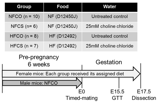 Six-week-old C57BL/6J mice were purchased from Jackson Laboratories. The mice were kept at a temperature of 22 °C, humidity 40%–60%, and a 12-hour/12-hour light/dark cycle. Regular bedding and enrichment were provided in the cages. Female mice were divided into groups receiving either a high fat diet (HF) or a normal fat control diet (NF). The HF diet contained 60% kcal fat (Research Diets D12492, Research Diets, New Brunswick, NJ, USA) and the NF diet contained 10% kcal fat (Research Diets D12450J). The animals either received 25 mM choline chloride in water (CS) or control untreated drinking water (CO) throughout the study period. Based on the different diets and choline supplementation, the four experimental groups were: NFCO (normal fat, untreated water), NFCS (normal fat, choline supplemented water), HFCO (high fat, untreated water), and HFCS (high fat, choline supplemented water) (Figure 1). Male mice for mating followed the NFCO diet and fluid assignment. All animals had free access to food and water. Composition of experimental diets was previously described by others [29,30]. The HF diet had a higher calorie density than the NF diet (5.24 versus 3.85 kcal/g). Choline bitartrate was added to both diets at a 2 g/4057 kcal basis. Other components in the diets (e.g., lard) also contain choline moieties. We measured the choline content in each non-chemically defined ingredient of the diets and found that the total choline content in the HF diet (10.33 mmol/kg) was estimated to be higher than the NF diet (7.58 mmol/kg) [31].
