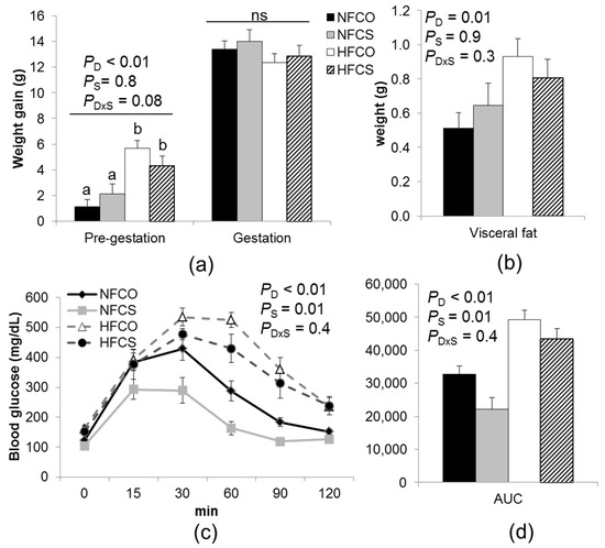 Weight gain and intraperitoneal glucose tolerance (IGT) of dams fed experimental diets. (a) Weight gain was measured both before timed-mating and during gestation (E0.5–E17.5); (b) Visceral fat was measured at E17.5; (c) IGT tests were conducted at E15.5 with 2 g/kg D-glucose injected; (d) The area under the curve (AUC) of the IGT tests. NFCO (solid bars): n = 10; NFCS (shaded bars): n = 6; HFCO (open bars): n = 8; HFCS (hatched bars): n = 7. Data were analyzed using the general linear model. Posteriori analysis of variance (ANOVA) followed by posthoc Fisher‘s least significant difference (LSD) analysis between groups was conducted with pd×s ≤ 0.2. Values are mean ± standard error of mean (SEM); different letters indicate p < 0.05 in the posthoc analysis. ns: pd, ps, and pd×s, not significant. CO: control; CS: choline supplemented; D: diet; HF: high-fat diet; NF: normal-fat diet; S: supplementation.