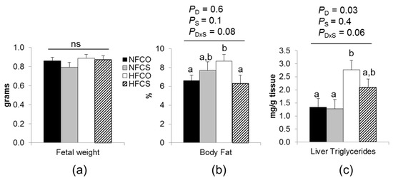 Fetal weight and adiposity at E17.5. (a) Fetal weight; (b) percent total body fat of fetuses; (c) fetal liver triglyceride concentrations. Experimental diets were fed to dams from 6 weeks before timed-mating to gestational day 17.5. Data were analyzed using the general linear model. Posteriori analysis of variance (ANOVA) followed by posthoc Fisher‘s least significant difference (LSD) analysis between groups was conducted with pd×s ≤ 0.2. NFCO (solid bars): n = 9; NFCS (shaded bars): n = 6; HFCO (open bars): n = 7; HFCS (hatched bars): n = 6. n is the number of dams. Fetal weight was analyzed with pooled data of all fetuses in each dam (5–10/dam); body fat and liver triglyceride concentrations were analyzed with pooled data of two randomly selected fetuses in each dam. Values are mean ± standard error of mean (SEM); different letters indicate p < 0.05 in the posthoc analysis. ns: pd, pS, and pd×s, not significant. CO: control; CS: choline supplemented; D: diet; HF: high-fat diet; NF: normal-fat diet; S: supplementation.