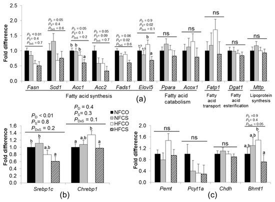 Another significant difference between the HFCS and HFCO fetal livers relates to their betaine content, suggesting that the epigenetic regulation of hepatic genes could be affected by the different availability of this methyl donor for DNA and histone methylation. The lower expression of Bhmt1 in the HFCS group versus the NFCO group may also indicate an ample supply of betaine as the substrate for methyl group donation and generation of S-adenosylmethionine, because S-adenosylmethionine provides feedback inhibition which downregulates BHMT [40]. Supplementation of betaine to the maternal diet has been shown to enhance DNA methylation of genes involved in cholesterol metabolism in neonatal piglets [26]. The genes that we observed to be downregulated in the HFCS group, such as Srebp1c and Fads1, have also been reported to be regulated by DNA methylation in other studies [48,49]. Further study is needed to quantify DNA methylation of the lipogenic genes to confirm the role of epigenetics in controlling their expression in the current model.