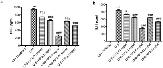 The levels of the pro-inflammatory cytokines TNF-α and IL-1β were evaluated by Elisa kit. An increase in the production of both TNF-α and IL-1β was recorded after LPS stimulation (Figure 3a,b). However, pre-treatment with both NP and RP significantly decreased the levels of TNF-α and IL-1β in a concentration-dependent manner (Figure 3a,b).