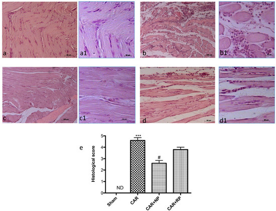 To assess the anti-inflammatory and antioxidant effects of NP and RP, the palm of hind paw tissues were examined by hematoxylin and eosin staining. While tissue from sham-treated rats showed no histologic alteration and normal fibers (Figure 6a and insert Figure 6a1, see histological score Figure 6e, a disorganized muscle fibers of various shapes and sizes with irregular contours, important amassing of infiltrating inflammatory cells, edema, loss of normal muscle paw architecture, and increased inter-fiber space were evident after CAR injection into the right hind paw (Figure 6b and insert Figure 6b1, see histological score Figure 6e). Muscle fibers of normal appearance, exhibiting some infiltrating inflammatory cells, was observed after NP treatment (Figure 6c and insert Figure 6c1, see histological score Figure 6e). However, treatment with RP failed to ameliorate this damage, in which accumulation of infiltrating inflammatory cells, edema, increased inter-fiber space and disorganization of normal muscle paw morphology were still observed (Figure 6d and insert Figure 6d1, see histological score Figure 6e).