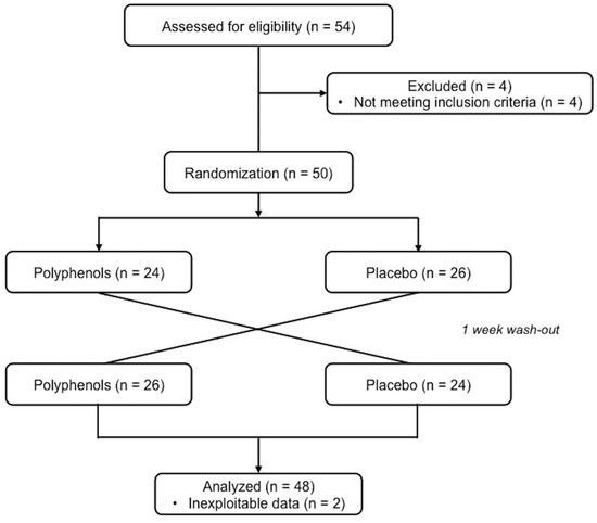 To alleviate oxidative stress, some ergogenic strategies have been tested. Numerous studies have reported that different types of supplementation such as polyphenols were of interest to protect against these mechanisms [4,5,6]. Indeed, although some studies demonstrated no or harmful effects [7,8], most studies observed the positive effects of antioxidants on oxidative stress or performance [9,10,11]. More particularly, polyphenols, have great antioxidant capabilities and protective effects [12,13]. In addition, polyphenols increase the synthesis and bioavailability of nitric oxide (NO) [14,15] which is well known as the most important mediator of vasodilation [16]. NO also plays an important role in many functions such as blood flow, mitochondrial respiration and platelet function [17]. As a consequence, the beneficial effects of NO have been demonstrated on muscle strength [18,19], but also during recovery following intensive efforts [20].