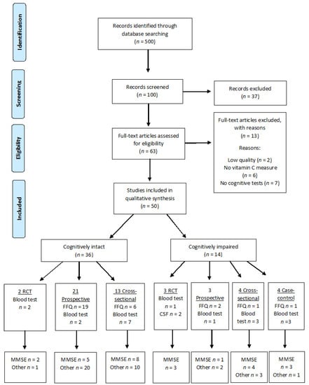 Study designs included randomised controlled trials, prospective cohort, cross-sectional, and case-control, restricted to those in the English language. This selection included adult participants who were either cognitively intact or diagnosed with a neurodegenerative condition such as Alzheimer’s or dementia. Studies that administered some form of vitamin C measure and quantitative cognitive assessment were accepted.
