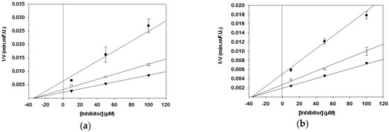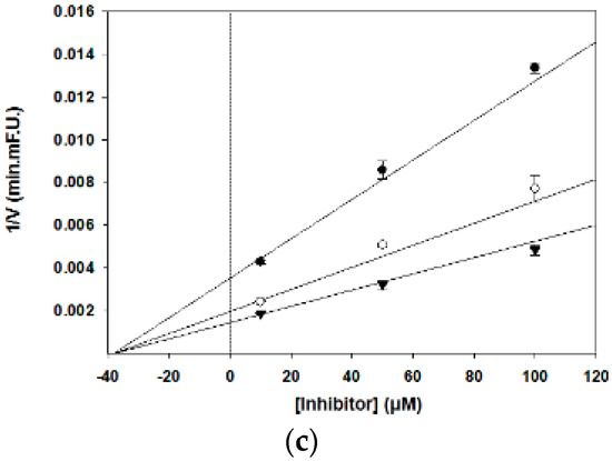 Dixon plot of the reciprocal initial velocities of (a) nobiletin, (b) tangeretin, and (c) sinensetin against BACE1 concentration at several fixed substrate concentrations: 250 nM (●); 500 nM (○); 750 nM (▼).