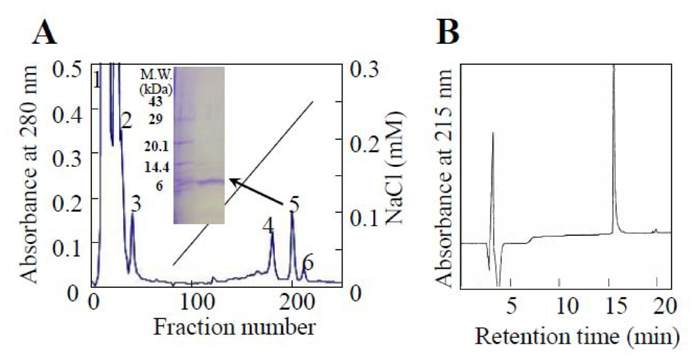 Elution profiles for the isolation of praescuta toxin from Praescutata viperina venom. (A) CM52-cellulose column chromatography. Praescutata viperina crude venom (20 mg) was applied to a column of CM52-cellulose (1.5 × 45 cm) equilibrated with 0.01 M potassium phosphate buffer (pH 7.8). The column was eluted with linear gradient from 0 to 0.3 M NaCl in a total volume of 600 mL of the same buffer. Fractions of 3.0 mL were collected at a flow rate of 13.5 mL/hr. SDS-PAGE of praescuta toxin under reduced condition. (B) Reversed-phase HPLC of praescuta toxin. The fraction 5 from CM52-cellulose column was applied to Develosil 300 ODS-HG-5 (4.6 × 250 mm) column equilibrated with solvent A (0.1% trifluoroacetic acid in H2O). Elution was achieved over 40 min with a linear gradient from 0 to 60% using solvent B (0.1% trifluoroacetic acid in acetonitrile) at a flow rate of 1.0 mL/min.