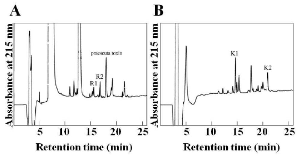 Fractionation of peptides obtained by digestion of praescuta toxin. The digestion of praescuta toxin was performed with endoproteinase Arg-C (A) and endoproteinase Lys-C (B). Elution conditions were the same as described in Figure 2B. The following abbreviations are used for the peptides: R1 and R2, endoproteinase Arg-C; K1 and K2, endoproteinase Lys-C.