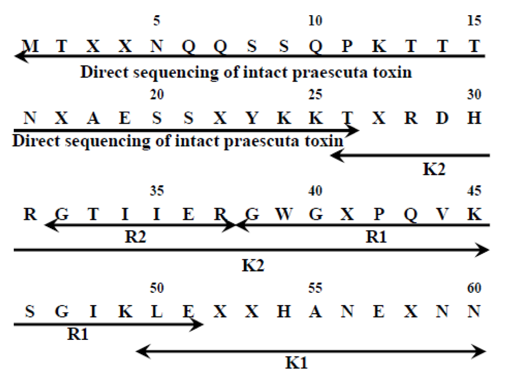 Praescuta toxin was digested with endoproteinase Arg-C or endoproteinase Lys-C and different fragments were isolated by reversed-phase HPLC as shown in Figure 3A and Figure 3B.