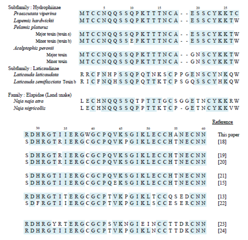 Comparison of amino acid sequence of praescuta toxin with several neurotoxins from sea snake and Elapidae snake.