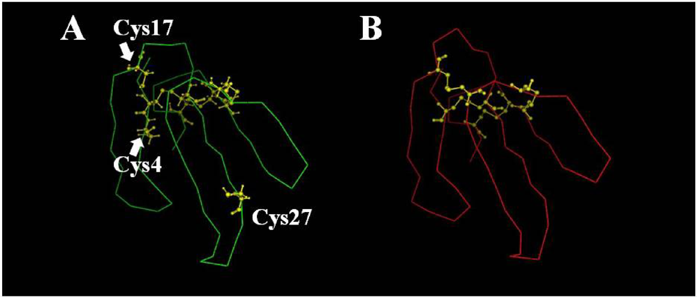 Molecular modeling of praescuta toxin was performed using the information from samples of six neurotoxins which were selected from Protein Data Bank (PDB) as homologous proteins to this toxin. Figure 6A shows the protein model of praescuta toxin with the positions of nine cysteine residues. Comparing with α-neurotoxin from the venom of Naja nigricollis [] (Figure 6B; PDB number 1IQ9), which had been chosen as the most homologous protein with 3-D sample information, Cys(27) of praescuta toxin exists at the tip of loopII. Since the positions of other eight cysteine residues of praescuta toxin [Cys(3), (4), (17), (22), (41), (52), (53) and (58)] are close each other, Cys(27) might exist alone without forming disulfide bonds. From the sequence data of α-neurotoxin indicated in Figure 5, the disulfide bonds of praescuta toxin are predicted to be formed between Cys(3) and (22), Cys(41) and (52), Cys(53) and (58) (Figure 7A-C). Cys(17) of praescuta toxin possibly bound with Cys(4), however, their positions on protein model are relatively apart (Figure 6A) and the formation of bonds between Cys(4) and (17) might cause an unstable structure. The substitution of Cys(27) and Trp(39) in praescuta toxin caused the lack of functionally important tryptophan residue to exist on loopII (Figure 8B), which participates in the stability of toxin-receptor complex. In addition, the existence of tryptophan residue at the position of 39 (Figure 8A) might induce conformational insecurity of praescuta toxin. Thus, these protein models elucidate the reasons of relatively weak toxicity of praescuta toxin clearly.