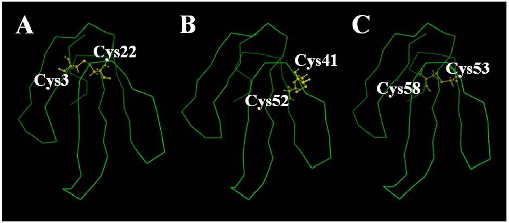 Molecular model of praescuta toxin with the speculated disulfide bonds. (A) Cys(3) and Cys(22), (B) Cys41 and Cys52, (C) Cys53 and Cys58. The position of disulfide bonds were speculated by comparison of praescuta toxin with α-neurotoxin from Naja nigricollis venom.