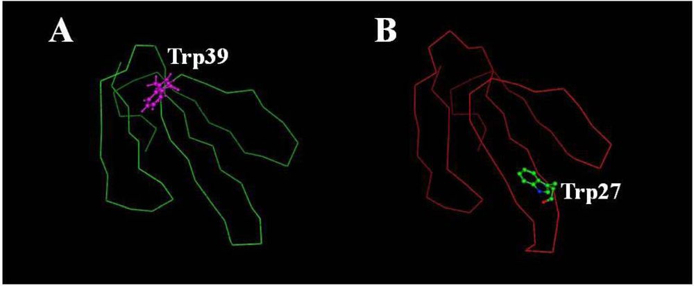 Presumption of the position of Trp(39) of praescuta toxin (A), and the position of Trp(27) exists on loop II of α-neurotoxin from Naja nigricollis venom.