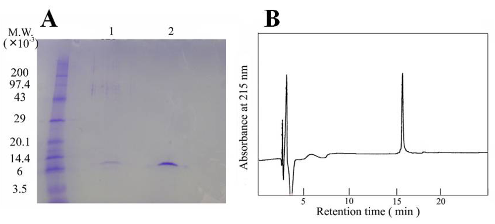 Homogeneity of the toxin was established by two independent methods: SDS-PAGE (Figure 2A) and reversed-phase HPLC (Figure 2B). In each case, a single band was observed. The yield of the aagardi toxin from 10 mg of H. torquatus aagardi venom was found to be 1.9 mg.