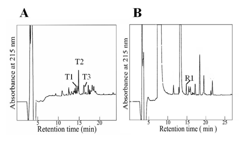 Aagardi toxin was digested with trypsin and different fragments were isolated by reversed-phase HPLC as shown in Figure 3A. The amino acid sequence of each fragment (T1, T2, and T3) was determined as shown in Figure 4. By endoproteinase Arg-C digestion, the fragment R1 was isolated and its amino acid sequence was determined (Figure 3B).