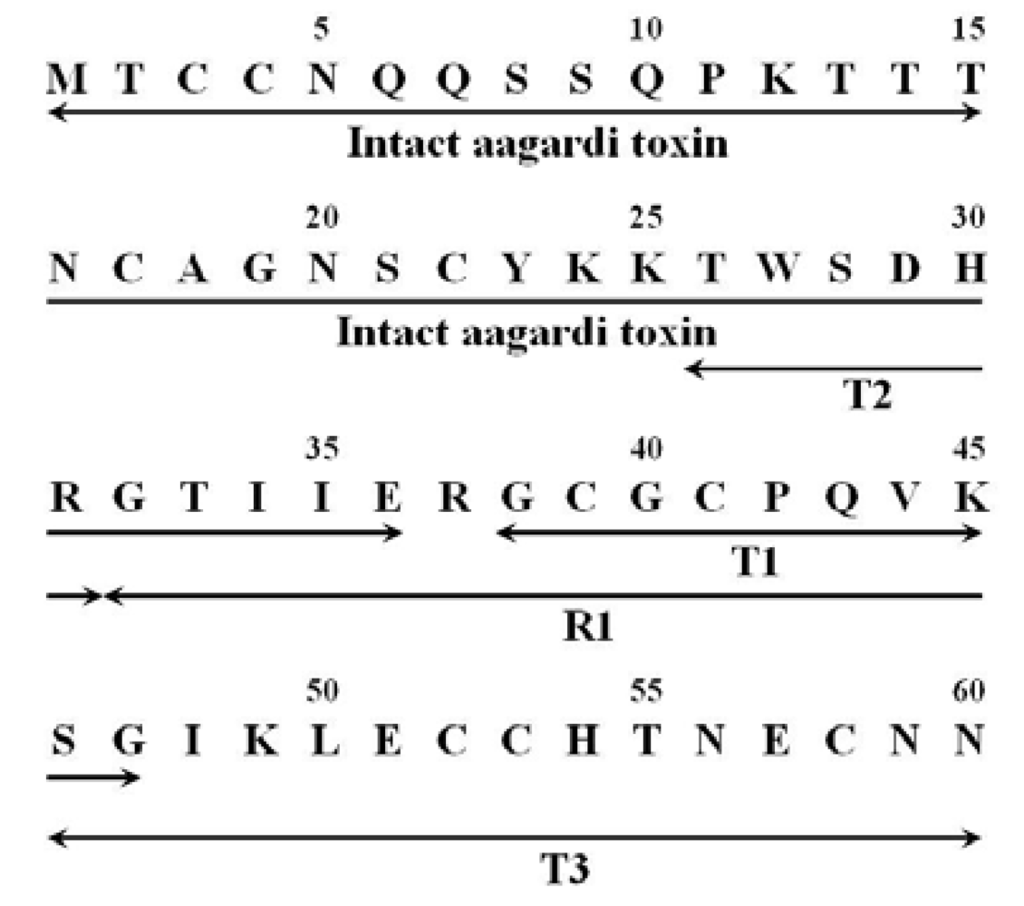 Amino acid sequence of aagardi toxin. Arrows indicate residues determined by sequence analysis. The following abbreviations are used for the some peptides: T, trypsin; R, endoproteinase Arg-C.