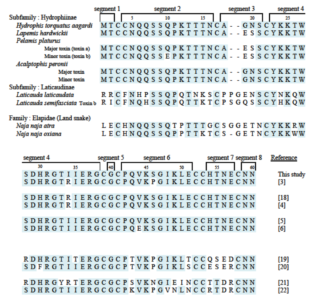 Two cobra toxins are presented here for comparison. Elapidae toxins are quite different from all Hydrophiinae toxins, especially in segments 3, 6, and 7. Comparison of the toxin sequences shown here reveals that primary structure is related to the phylogenicity of snakes: the more closely related, the more similar the amino acid sequence.